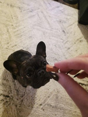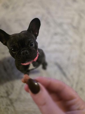 [This review was collected as part of a promotion.] The size of these treats are PERFECT for my frenchie. Great for redirection and reward! The smell is tolerable for me as a human but he goes NUTS FOR IT! Its not too chewy but its chewy enough for my boy! I cant speak to the taste personally but my dog loves it! He comes running when he hears the packaging opening!