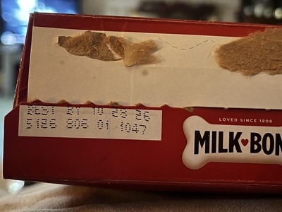 I have used Milk Bone products for years. This box, 2 of the 4 dogs would take the treats then drop them. They sat uneaten until the other dogs finally took them. This was a strange reaction by any of my dogs. A few days later I was offering them again. One dog took a treat and dropped it. He is very treat motivated. I looked at those left in my hand and saw green fuzz on them. I looked in the box and saw there was mold growing in the box. I was horrified. This batch definitely needs to be recalled!!