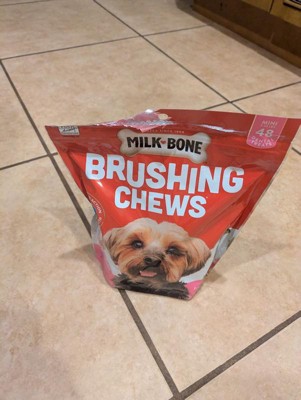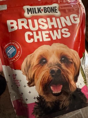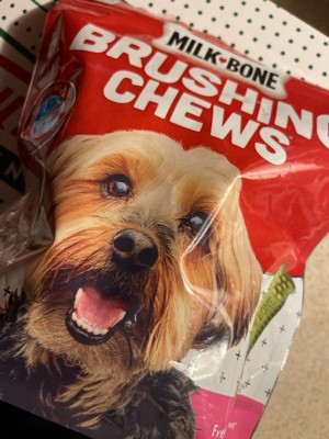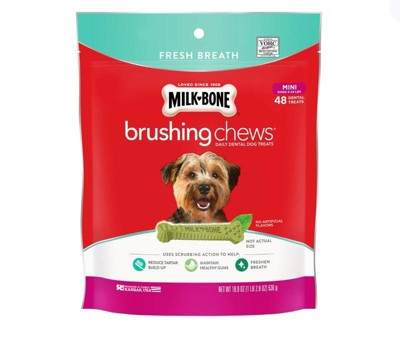 [This review was collected as part of a promotion.] My dog is sweet but his breath, not so much. With Milk-Bone Brushing Chews Fresh Brush Daily Dental Treats Mini his breath is no longer a worry. I give it to him as a treat and as a meal topper. He absolutely loves them. The bag is a great size. Thank you Milk Bone and Influenster for allowing my dog to try this product.