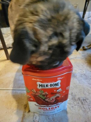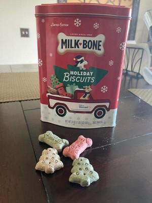 - CONTAINS: One 24-oz. collectible tin of Milk-Bone Holiday Biscuits