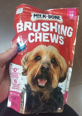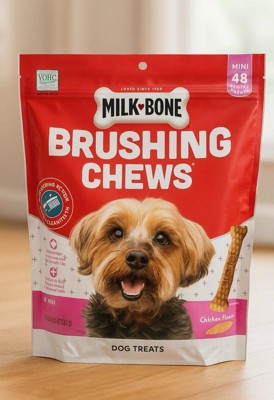 - CONTAINS: 48 mini-sized Milk-Bone Brushing Chews Original Chicken Flavor dog dental treats (packaging may vary)