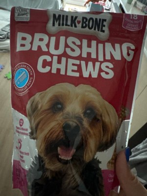 *When fed daily, Milk-Bone Brushing Chews are as effective as brushing a dog’s teeth twice a week based on the reduction of tartar build-up and bad breath. The Veterinary Oral Health Council recommends daily tooth brushing for optimal effectiveness.
