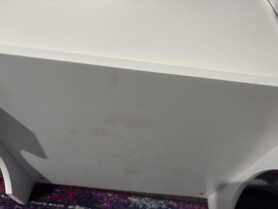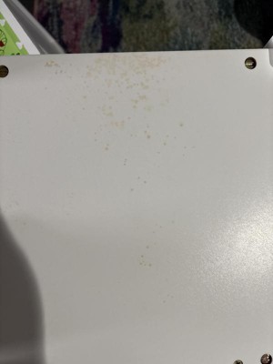 The bottom of the table, one side at the bottom, the bottom of not chairs as well as the fabric cubes in those shelves had yellow mold growth show up. Had to throw out the table. I don’t have a humid house and we use air purifiers and a dehumidifier. Was in shock when we we were going to give it to a friend and saw the bottoms. I should have taken photos before wiping it off as I didn’t think it was mold at first. But it stained the wood yellow after wiping it off.