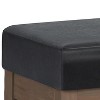 Hand constructed using solid wood, plywood, foamUpholstered with a durable Midnight Black Vegan Faux LeatherFeatures solid wood framed base, legs and comfortable cushioned seatMulti-functional ottoman can be used in bedroom, living room, family room, hallway as an entryway bench, foot stool or provide additional sittingContemporary, urban styling, available in two sizesAssembly RequiredDimensions: 14.4in D x 44.1in W x 18.3in HEfforts are made to reproduce accurate colors, variations in color may occur due to computer monitor and photography
