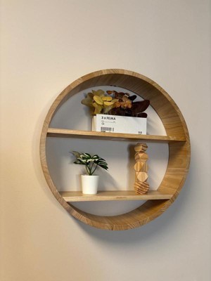 - Stylish Round Wall Shelves: This round wall shelf features a rayon from bamboo frame with two shelves. It's perfect for displaying books, photo frames, or decorative items. Equipped with metal hardware for secure wall mounting