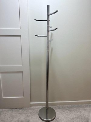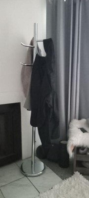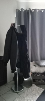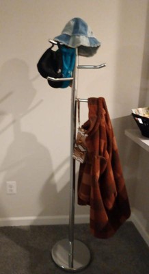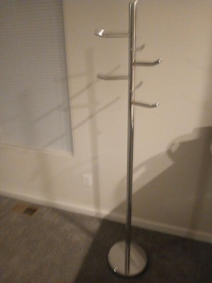 [This review was collected as part of a promotion.] Got this to put in the living room. It works great. it can hold some of our more heavier coats and it doesn't move or tip over. The silver matches the room and looks nice. It doesn't take up a lot of space and saves us room in the closet. I am happy with it.