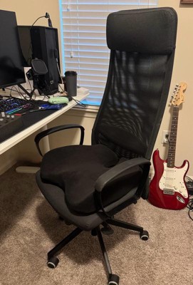 [This review was collected as part of a promotion.] I work from home so I sit in an office chair basically all day. This memory foam seat cushion fits perfectly on my office chair and feels great. I did need to lower my chair because the cushion gave me more height. I felt less pressure on my back with more support. This conformed to my body shape giving me extra support on my bottom. When you sit all day you know the feeling of going numb, so this cushion made my chair a lot more comfortable.