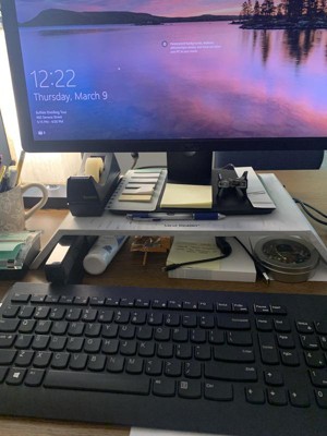[This review was collected as part of a promotion.] I wanted my monitor at work higher in order to be more comfortable when using it all day long. This stand is very good quality, nicely made & not just boring metal or plain plastic, it had a nice marble effect. Offers me additional storage for various items under the monitor as well!