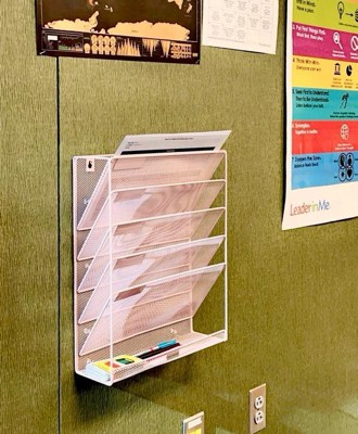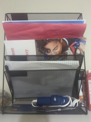 [This review was collected as part of a promotion.] Pros: holds many books/folders/materials, does well standing up on its own with documents and small books, works well in a special education office for these purposes Cons: hard to place on the wall-wish it came with less permanent mounting options, don’t love that it’s mesh because it makes it harder to grasp onto sticky command strips and makes it less versatile