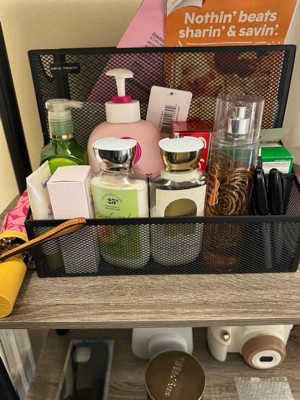 Constructed from durable metal mesh, this organizer can be easily cleaned with mild soap and a cloth for daily use. Weighing less than a pound, it's portable, allowing you to move it from your home office to your kitchen with ease. Measuring 12.15 inches long, 9.5 inches wide, and 9.5 inches tall, the small front compartments can be used for organizing pens, notepads, and electronic devices.