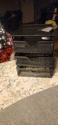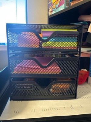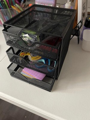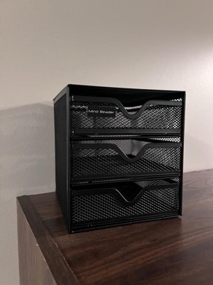 [This review was collected as part of a promotion.] I love this little mesh storage organizer. I put it right next to my computer and now have all my little odds and ends neatly stored in this organizer. It has 3 drawers that you can pull out and is a compact size so it wont be in your way. Cute and compact