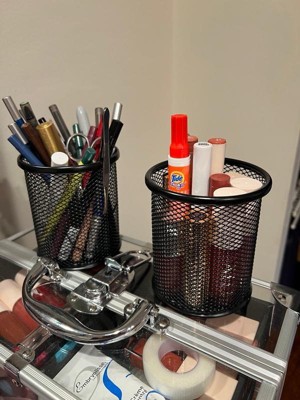 [This review was collected as part of a promotion.] I received this Mind Reader 3 pack of pen and accessories holder set and these are very practical and functional. The cups are made out of a metal mesh that does not crush easily. No worries of easily sticking a pen or scissors thru the side of the cup. The size is ideal to hold several pens, pencils, scissors, notepads, etc. I like the 3 pack of cups to offer many different options to store your office supplies. These will be easy to clean and with the black coloring, it won't show pen ink if you happened to have a pen leak. I would recommend this Mind Reader 3 pack of pen and accessories holder cups.