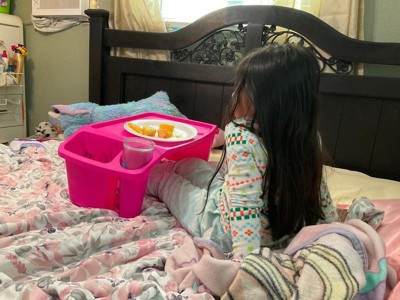 [This review was collected as part of a promotion.] I am a mommy to a 4 year old princess who loves to eat snack in bed so when we received this we couldn’t wait to try it! She uses to to eat her snacks in while watching a movie of course lol, she also uses it when she wants to draw and make works of art. My only complaint is that it doesn’t fit over her car seat so we don’t get to take it on trips.
