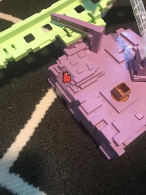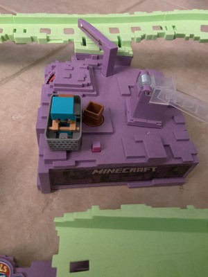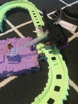 Race into The End – the final, iconic level of Minecraft – with a Hot Wheels RacerVerse Diamond Armor Steve and defeat a spinning, fearsome Ender Dragon! Wind up the nemesis and slam launch Steve in his die-cast Minecart at just the right time to do a jump-stunt and race to avoid getting knocked off the track. Each completed lap lowers the enemy's health bar, and when she's defeated after six laps, Ender Dragon flips over. Colors and decorations may vary.
