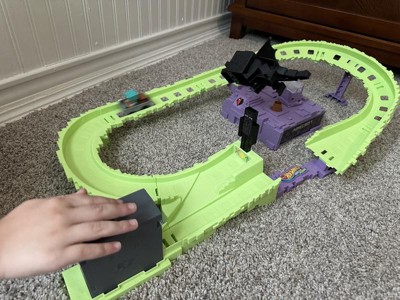 [This review was collected as part of a promotion.] We loved this race track! It's pretty compact but the size works well for the purpose of it. We were so entertained trying to race past the dragon. It was so impressive to see the health of the dragon change with every lap. It was incredibly well made and thought out because as soon as the car finishes a lap, it goes right back to the launch spot. We love the Armor Steve car, but other cars work well. I'm very happy that the kids have to use a crank to set it up instead of using batteries. We love it.