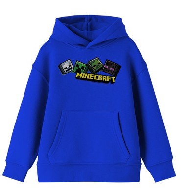 Celebrate the creative crafting game with this Minecraft sweatshirt. The hoodie features block heads of a skeleton, a creeper, a zombie, and an enderman from the Minecraft series while yellow letters blow spell out the game's title. The sweatshirt comes in royal blue with a large pouch pocket and a double-lined hood. Fans of the Minecraft series will love this fun design.