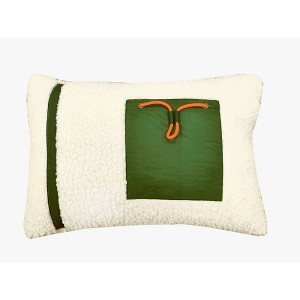 Medium sized lumbar pillow with a fleece cover. The pillow has a dark green accent stripe and a dark green nylon pocket stitched on the front. The pocket will hold a smartphone. The pillow is firmly stuffed so seems very supportive. The pillow design and color palette suits a teen boy or man. The cover is 100% polyester.
