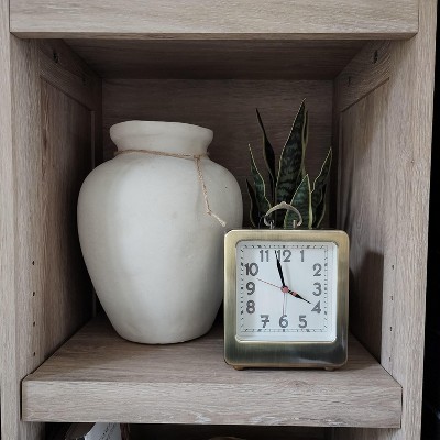 Add a functional and classy touch to any room with this Mini Analog Table Clock from Hearth & Hand™ with Magnolia. Designed with a metal frame, this compact clock has a square body with rounded edges, a hinged loop handle at the top and stands on four small, round feet. It uses Arabic numerals on an off-white clock face, making the numbers easy to read. Crafted from metal and plastic, it runs on a single alkaline battery for easy maintenance and everyday use.