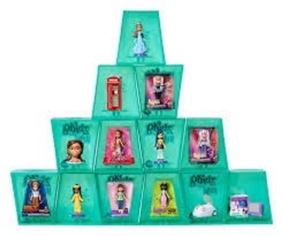 Each mystery trapezoid capsule turns into a stackable display and comes with two Mini Bratz™ in mini replica packaging and a collector’s guide! Now in a super stylin’ new teal color! Each package is blind so you won't know which figures you get until you unbox them!