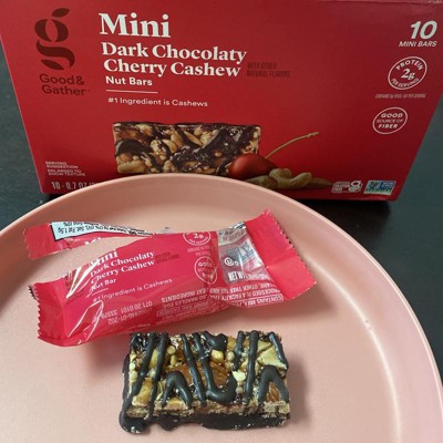 [This review was collected as part of a promotion.] These are the good and gather mini dark chocolaty cherry cashew nut bars. The price is pretty great for a ten pack of these bars. I love that I can enjoy these as a treat before bed, similar to a dessert, and my kids can enjoy them as a snack before their sporting events. The cherries have such a fresh taste and texture. The only downside for me is the added sugar content. I received an incentive to write this review.