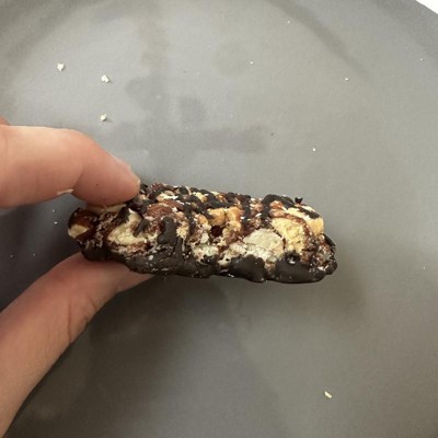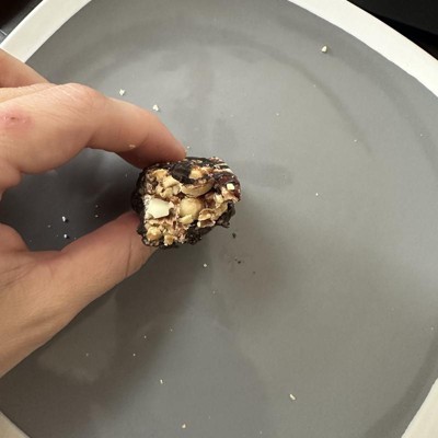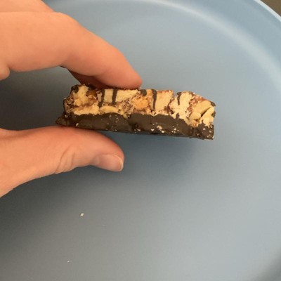 These are so tasty! Perfect little snack and you don’t need to feel guilty for eating it. Basically a fun sized candy bar, but with protein and fiber and without ton of sugar. A perfect combo of sweet and salty, it satisfies the craving for a treat while almost being healthy. It was hard to eat without getting melted chocolate on my fingers, and the nuts are super crunchy so it took a bit to bite into, but those things hardly matter.