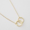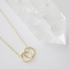 This necklace features two small interlocking circles on a thin, lightweight chain. The design is simple and modern, with a low-profile feel that makes it easy to wear daily. Great on its own or layered with other pieces, it’s a versatile go-to with just enough detail to stand out. Length: 18". Charm: 20 mm x 10 mm