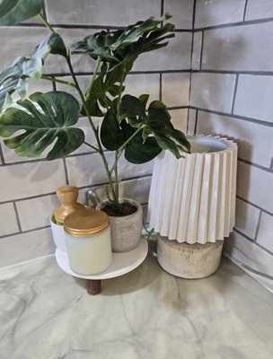 [This review was collected as part of a promotion.] This is such a cute little lamp. I love the small size as I plan to use it on either an entryway table or the mantle. The bottom part isn't super tall but it is sturdy. It is a nice fake wood look. It's a very light beige. Unfortunately I think I got a defective one as I couldn't get it to turn on. I had trouble getting the light bulb to screw in