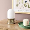 Create a cozy ambiance in your home with this Mini Lantern-Style Lamp from Room Essentials™. This compact table lamp features a white dome-shaped glass shade atop a flared metal base in an antique brass finish for a gleaming lantern-style look. The convenient turn knob rotary switch offers one-way on/off control, and the five-foot cord provides flexible placement. Perfect for adding light to your bedside table, work desk or console table.