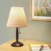 Add ambient lighting to your space with this Mini Lamp Stick Lamp from Room Essentials™. This compact table lamp features a sleek black metal pole body on a raised round base topped with a white fabric tapered drum shade for a modern look. The convenient pull-chain switch offers one-way on/off control, and the five-foot cord provides flexible placement. It's perfect for adding light to your bedside table, work desk or console table.