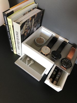 MINI STOWIT JEWELRY BOX I already own the large size Stowit jewelry box and it was worth the purchase. I needed a secondary solution for my extensive watch collection and miscellaneous accessories. The hidden compartments really stood out for me living in a small space I really gravitate towards small space solutions, no clutter in sight. Gentlemen this “jewelry” box works for us too, able to hold, cufflings, tie clips, and watches. Timeless modern design, another great addition to my home Umbra.
