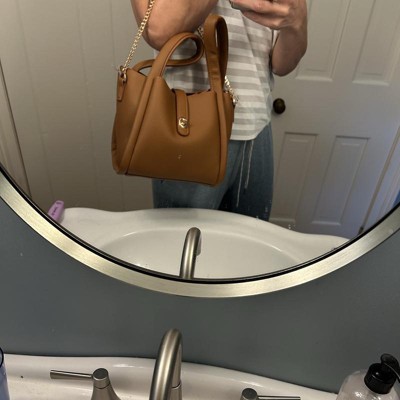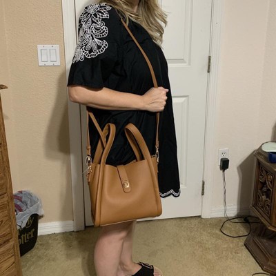 [This review was collected as part of a promotion.] So many ways to wear and style this bag! First, I love that the inside is brushed so it looks like real leather even though it’s faux. The bag has a brown adjustable strap that can be worn as a cross body. It also has small handles that can be held by hand. I love the position of the handles as they are on the ends and not in the usual spot of the sides. The bag also has a gold chain that can be used as a small strap. So many options! I received an incentive to write this review.