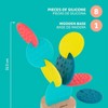 - The pieces are made of soft silicone for safe chewing and play, and the base is constructed from wood