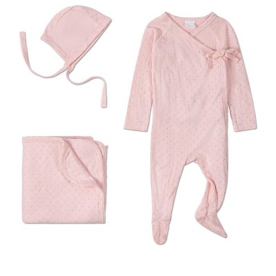 She'll be cozy from top to toe in this beautiful 3-piece set. The charming cuffed cap keeps her little noggin toasty. The cute cuddle blanket surrounds her with cloud-like softness. And the comfortable footie pampers her delicate skin. All 3 pieces come in our cotton-rich blend with a dainty floral print for feminine charm.