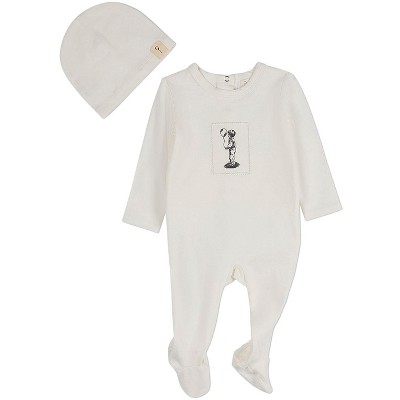 Keep him cozy from head to toe in this charming 2-piece set. It's made of our premium blend: pure cotton for soothing softness plus spandex for shape-keeping fit. And it's loaded with darling details, from the beanie's playful topknot to the footie's vintage print. All this plus convenient back snaps for easy changes.