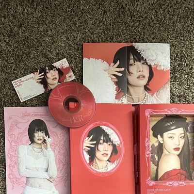 - MINNIE of (G)I-DLE releases her first solo album titled, HER. MINNIE’s first story is filled with many colors showcasing her vocal charm. Contents of the album include: CD, Sleeve, Booklet (80 pages), Lyrics poster, Photo Card (random 2 of 6), Bookmark, Pocket Digipack, 2 Cover Postcards, Special Poster and Colored Pencil. US/EU Exclusive: Photo Card (random 1 of 2).
