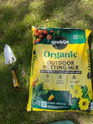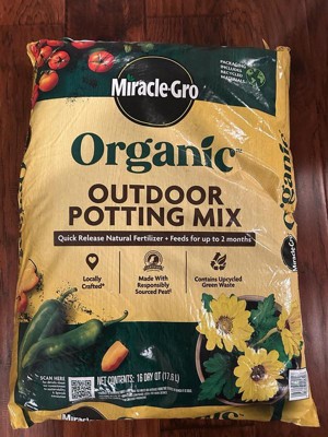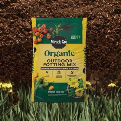 Embrace a new way to garden and grow your container plants with Miracle-Gro Organic™ Outdoor Potting Mix. This potting mix contains a quick-release natural fertilizer and also feeds plants for up to 2 months. Made with responsibly sourced peat*, this locally crafted** potting medium also contains upcycled green waste. This gardening product is also OMRI Listed for organic use. Use this organic potting soil with any outdoor container plant, including vegetables, herbs, flowers, annuals, and perennials. To apply, partially fill your pot with potting mix. Loosen the plant's root ball and place in the soil. Add more mix, covering plant roots, and press down lightly. To finish, water the plant thoroughly and let it drain. To avoid soil compaction and replenish nutrients, container plants should be repotted bi-annually with fresh potting soil. This 16 qt. bag of potting mix fills one 12-inch container (amounts may vary based on the size of the root ball). Nurture your plants with Miracle-Gro Organic™ Outdoor Potting Mix for Successful Organic Gardening Made Attainable™. *one hundred percent of peat sourced from certified producers **Product is manufactured less than 150 miles on average from the stores in which it is sold, excluding AK & HI.