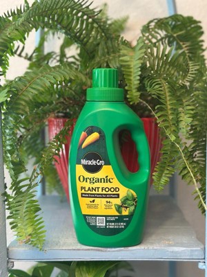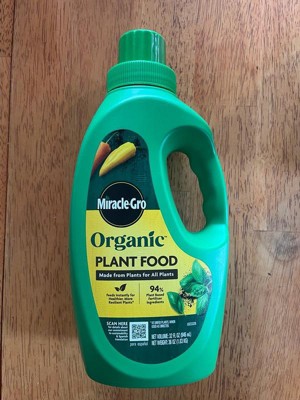 Feed your favorite plants with Miracle-Gro Organic™ Plant Food. Made with 94% plant-based fertilizer ingredients, this liquid plant food feeds instantly for healthier, more resilient plants (vs unfed plants, when used as directed). This gardening product is OMRI Listed for organic use. In addition, this plant food is made for all plants, including indoor and outdoor container plants and plants in gardens or raised beds. Shake container well before use. To use in gardens, fill cap to the 2nd line and mix 2 capfuls into 1 gallon of water. Feed by thoroughly soaking the soil around each plant. Reapply every 7-14 days. For indoor plants, follow the same directions using 1 capful per 1 gallon of water and reapplying every 2 weeks. 1 gallon of diluted plant food feeds up to 10 sq. ft. of garden. This 32 oz. container of Miracle-Gro Organic™ Plant Food makes up to 10.75 gallons of diluted plant food, enough to feed 10 medium-sized plants (1.75 sq. ft.) for a 3-month growing season, based on feeding once every 2 weeks with 22 fl. oz. of diluted plant food per plant.