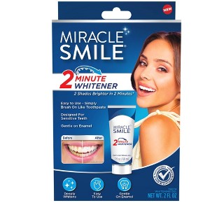 Experience the way towards a change in your smile—right at home. Formulated with advanced whitening technology and powered by hydrogen peroxide and perlite, Miracle Smile® 2 Minute Whitener helps you achieve a change of up to 2 shades in just 2 minutes*! So easy to use, simply brush on gel like toothpaste for two minutes, twice daily, to start your goal of whitening—no mess, no fuss. The professional inspired formula is intended to be gentle on enamel*** and designed for sensitive teeth. Perfect for pre-event touch-ups, daily maintenance, and confidence boost on the go.