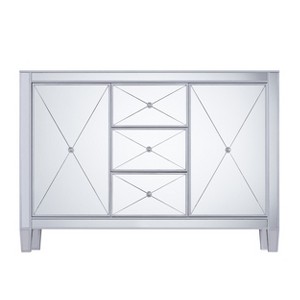 Reflect your glamorous side. Bathed in glistening silver from head to toe, this storage cabinet contains three stacked drawers and two spacious cabinets for a maximum amount of concealed organization. Chic details, such as crystal knobs, scored mirrors, and matte silver trim evoke Hollywood regency opulence. Add this elegant cabinet to your dining or living room and let your style stand out.