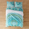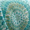 - THE MIRAGE TEAL DESIGN: One of our most popular quilt sets, Mirage is inspired by a lively bazaar. The front features a bright mandaland reverses tooverlapping medallions. A bound border provides contrast and texture to complete the look.