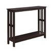 Update your home décor with the Mission Console Table with Shelf by Breighton Home. This piece displays a transitional and contemporary design that will fit well into any current room ensemble. Crafted from MDF and sturdy particleboard, this piece is built for durability. Utilize the spacious tabletop for everyday necessities and fill the bottom shelf with your favorite collectibles. Versatile in its design, this piece can be placed in your living room, entryway, den, or home office. Pair with other coordinating pieces from the Mission Collection by Breighton Home, each sold separately.