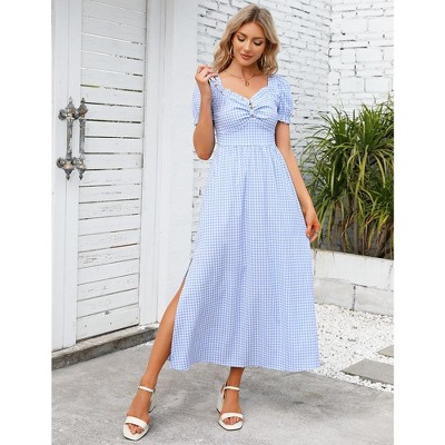 Women's Summer Boho Plaid Square Neck Short Puff Sleeve Dress Elastic Smocked Summer Beach Ruffle Midi Dress Blue XX-Large