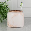 Misty Copper Made out of resin and metal. Resin look is inspired from the Italian marble called Michaelangelo. Metal part is in copper finish. Perfect for end tables, night stands, counter tops, vanities and desks throughout your home. This bath accessory set is sure to elevate the look of any bathroom decor and also add functionality and durability.