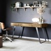 Combine industrial, urban style and function with the Mitchell Desk. This desk is crafted of solid Acacia and solid metal legs. Generous in size, this desk offers a spacious top surface and includes a keyboard tray for added convenience. Two notched handle drawers provide plenty of space for small office supplies. Working from home office or den never felt so good.