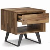 The Mitchell End Table provides an Industrial, Urban look and excellent functionality combined into one product. The table is handcrafted with a perfect combination of Metal and Solid wood. The drawer and open compartment provides plenty of space for storage. Whether you need a place for your favorite book, night lamp or drink – this is the piece of furniture for you.