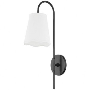 Collection: Dorothy, Material: Steel, Finish Color: Old Bronze, Width: 5.5", Height: 19.25", Depth: 9", Backplate Width: 4.75", Lamping Type: Incandescent, Number Of Bulbs: 1, Wattage: 40 Watts, Moisture Rating: Damp Rated, Desc: Dorothy resides where classic meets edgy, pairing sleek details with fanciful flair. The aged brass or old bronze stem is exaggerated to reveal a crisp linen shade, finished with a wavy edge for an ultra-cool effect.,