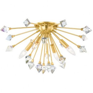 Collection: Genesis, Material: Steel, Finish Color: Aged Brass, Width: 22.5", Height: 11.25", Hanging Method: Flush, Lamping Type: Incandescent, Number Of Bulbs: 4, Wattage: 60 Watts, Moisture Rating: Damp Rated, Desc: A Mid-century marvel, the sputnik style has captivated design fiends for decades. Genesis reimagines this icon, bringing celestial glamour in starburst form. Dancing between each light source are iridescent crystals, creating prisms of light throughout the room. Finished in aged brass, the Genesis Wall Sconce, Flush Mount, and Chandelier is the statement-making piece you need.,