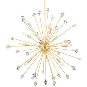 Collection: Genesis, Material: Steel, Finish Color: Aged Brass, Width: 36.5", Height: 34.75", Lamping Type: Incandescent, Number Of Bulbs: 9, Wattage: 60 Watts, Moisture Rating: Damp Rated, Desc: A Mid-century marvel, the sputnik style has captivated design fiends for decades. Genesis reimagines this icon, bringing celestial glamour in starburst form. Dancing between each light source are iridescent crystals, creating prisms of light throughout the room. Finished in aged brass, the Genesis Wall Sconce, Flush Mount, and Chandelier is the statement-making piece you need.,