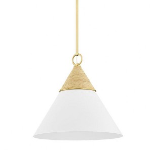 Collection: Mica, Material: Steel, Finish Color: Aged Brass, Width: 18", Height: 14.5", Lamping Type: Incandescent, Number Of Bulbs: 1, Wattage: 25 Watts, Moisture Rating: Damp Rated, Desc: A classic cone shape with coastal flair, Mica features a rattan-wrapped, textured white shade accented by beautiful Aged Brass for a casual yet sophisticated aesthetic. Add personality to a powder room with sconces, or highlight the heart of the home with a pair of pendants over your kitchen island. Part of our Megan Molten x Mitzi Tastemakers collection.,