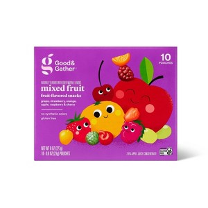 These 10-Count Mixed Fruit Flavored Snacks from Good & Gather™ are a great pick for packed lunches and convenient on-the-go snacking. Featuring a mix of naturally flavored grape, strawberry, orange, apple, blue raspberry and cherry flavors, these tasty fruit-flavored snacks are perfect. There are 10 pouches per box, and since they're made with no synthetic colors, you can feel excited about enjoying them yourself or giving them to the kids.